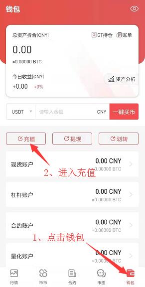 1、首先进入gate芝麻开门手机app(gate芝麻开门注册:点我注册),进入钱包界面,点击充值。
