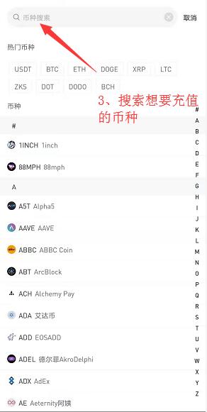 2、在搜索框内输入你想要充值币种的简称,如:BTC、USDT等,点击进入充值界面。