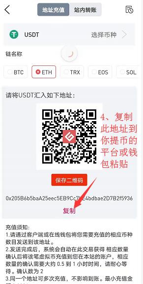 3、复制此地址,注意:名称一定要选择,对应的协议地址才能到账,比如选择ETH,那么只能充值ERC20协议的币种,然后到你想要提币的钱包或平台粘贴,直接提现,待确认达到平台指定数量,即可到账。