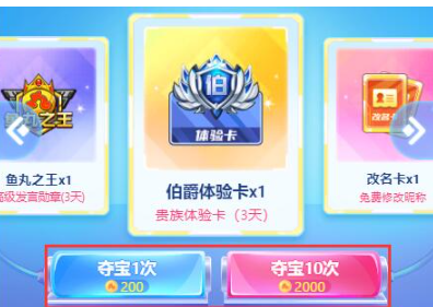 2、鱼丸夺宝有机会获得改名卡、发言勋章、贵族体验卡等奖励。