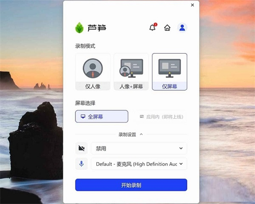 2、多种录制模式可供选择,包含全屏录制、摄像头录制以及区域录制。